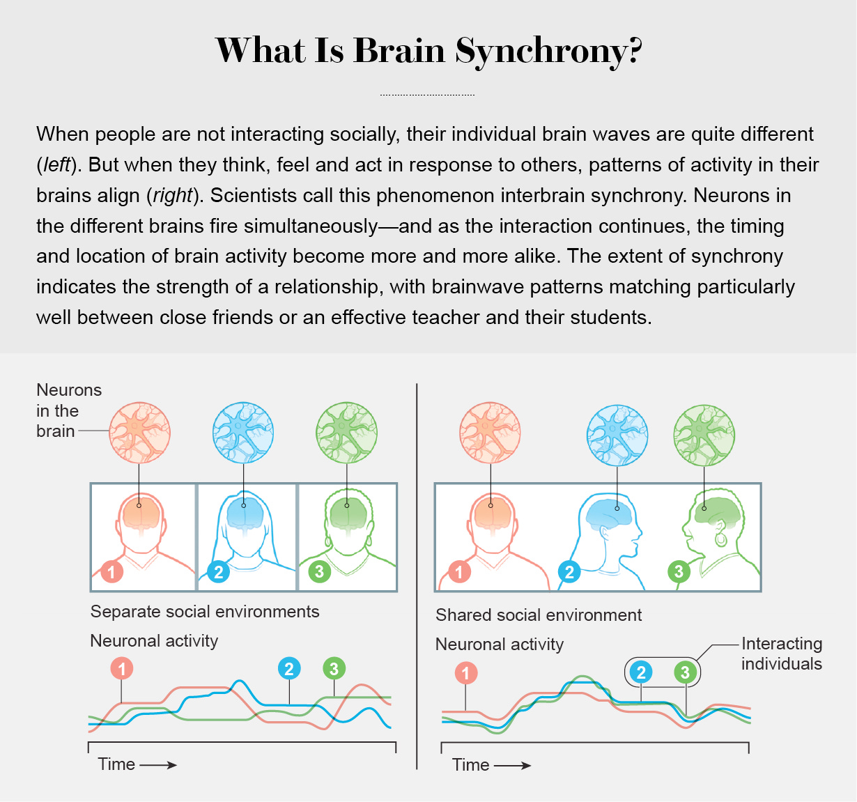 A phenomenon known as Brain Synchrony is being studied by neuroscientists to understand its role in social interactions. Early findings show that when people engage in conversation or share experiences, their brain waves synchronize, creating matching patterns. This synchronization is believed to prepare us for interaction and is seen as a positive or negative marker of relationships. This could potentially shed light on why we sometimes don't 'click' with others and why social isolation can be harmful to our health.